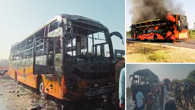 जैसलमेर बस हादसा: 57 सवारियों से भरी बस में लगी भीषण आग, कई यात्री झुलसे, जिला प्रशासन अलर्ट पर।